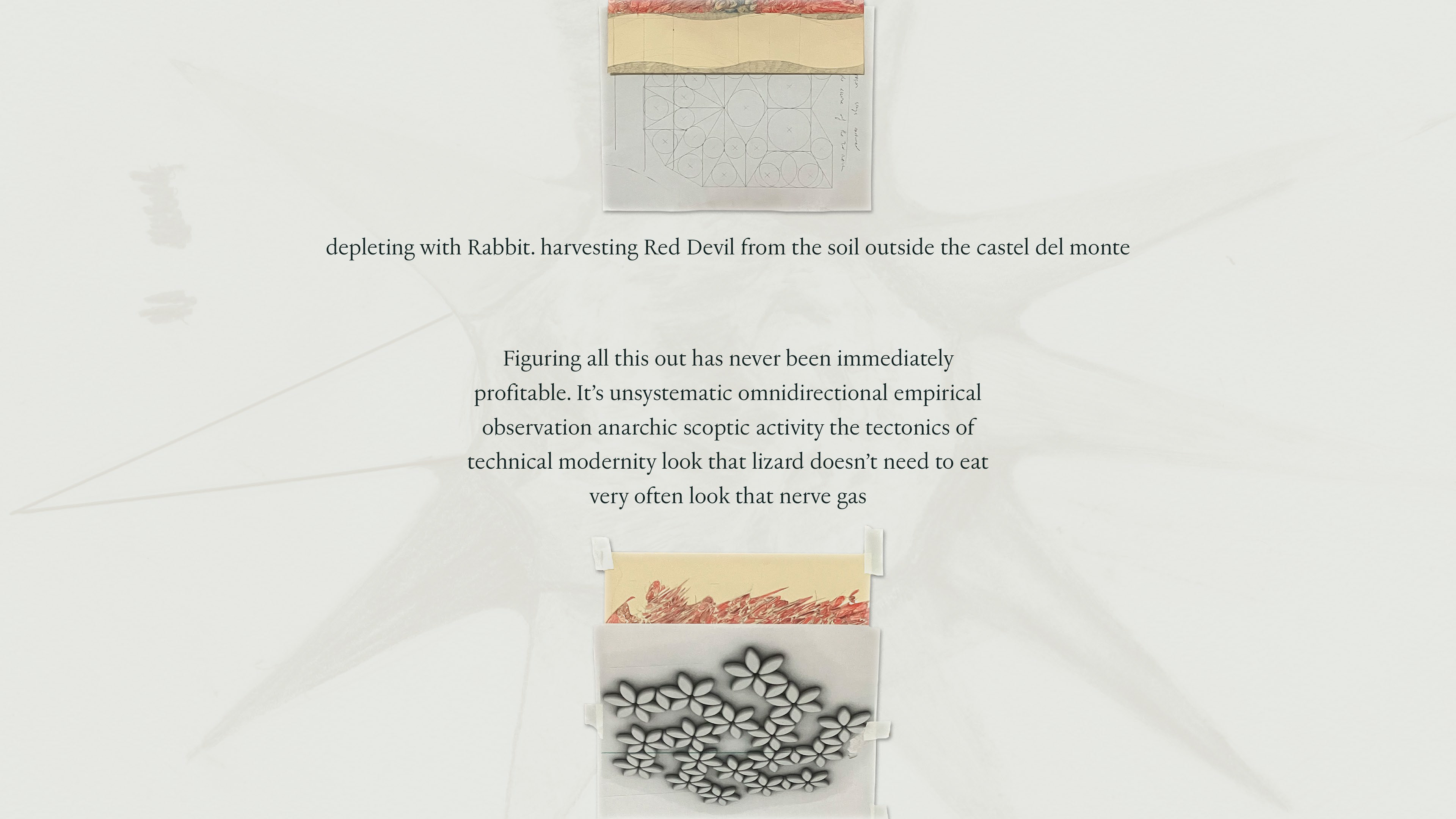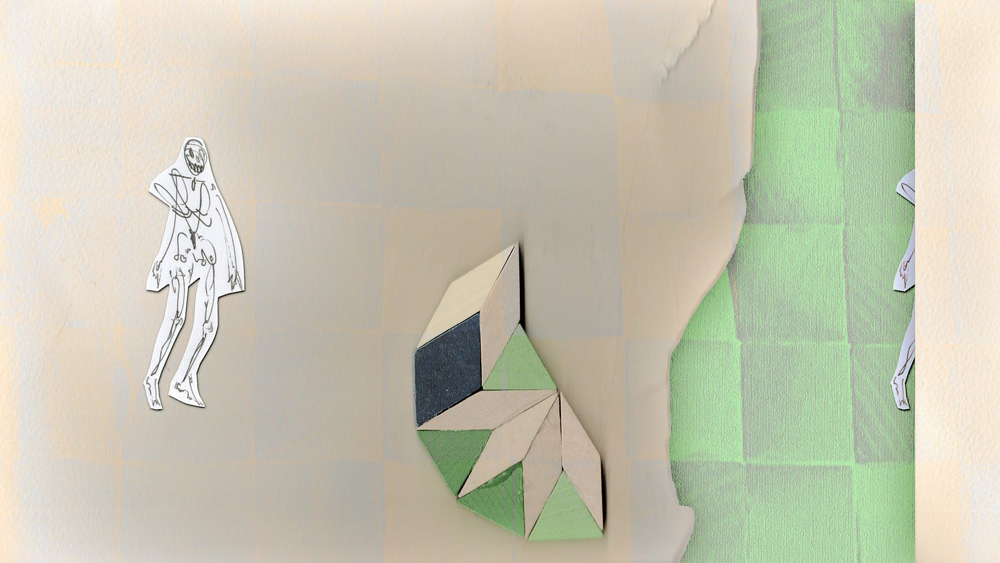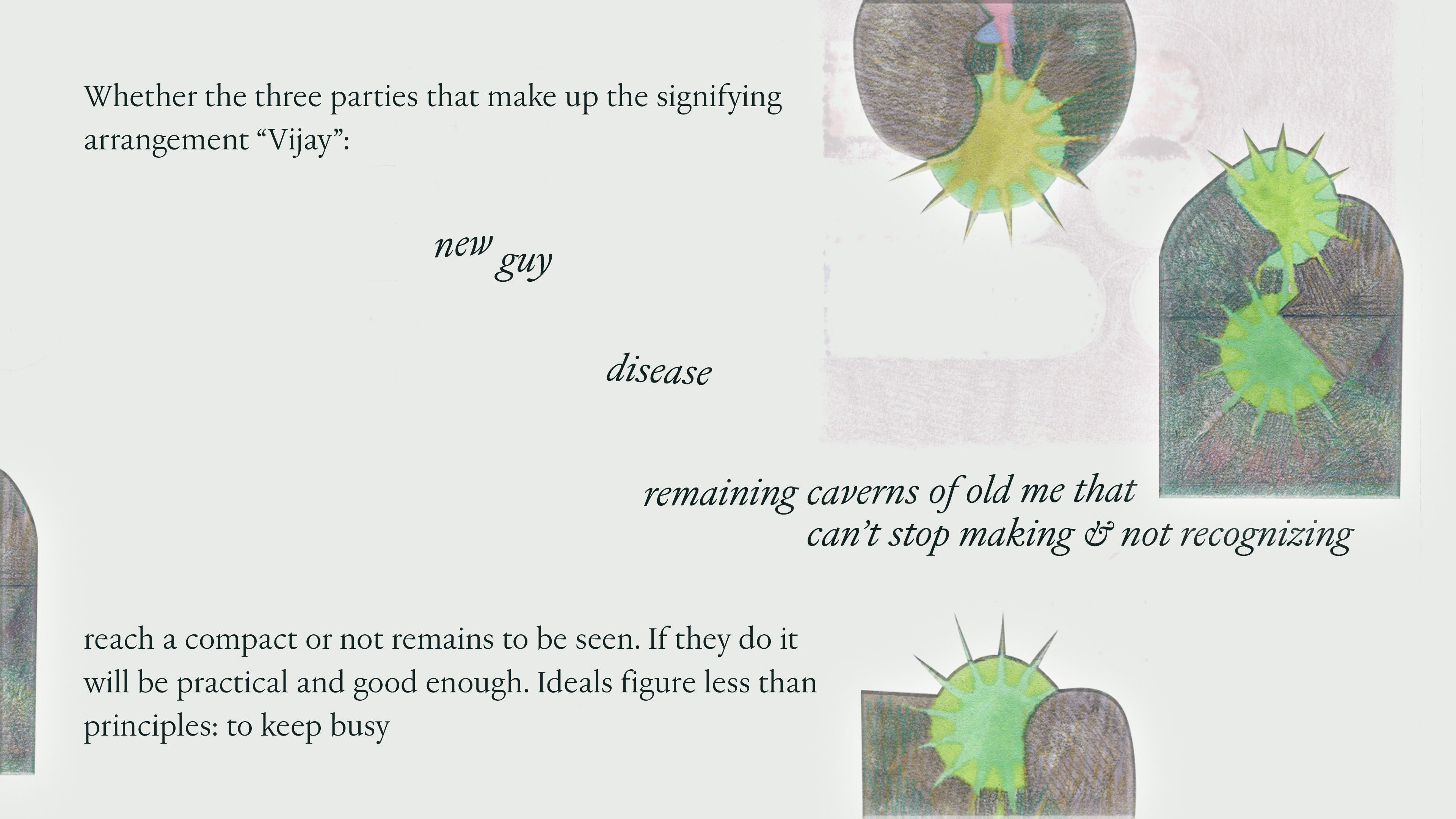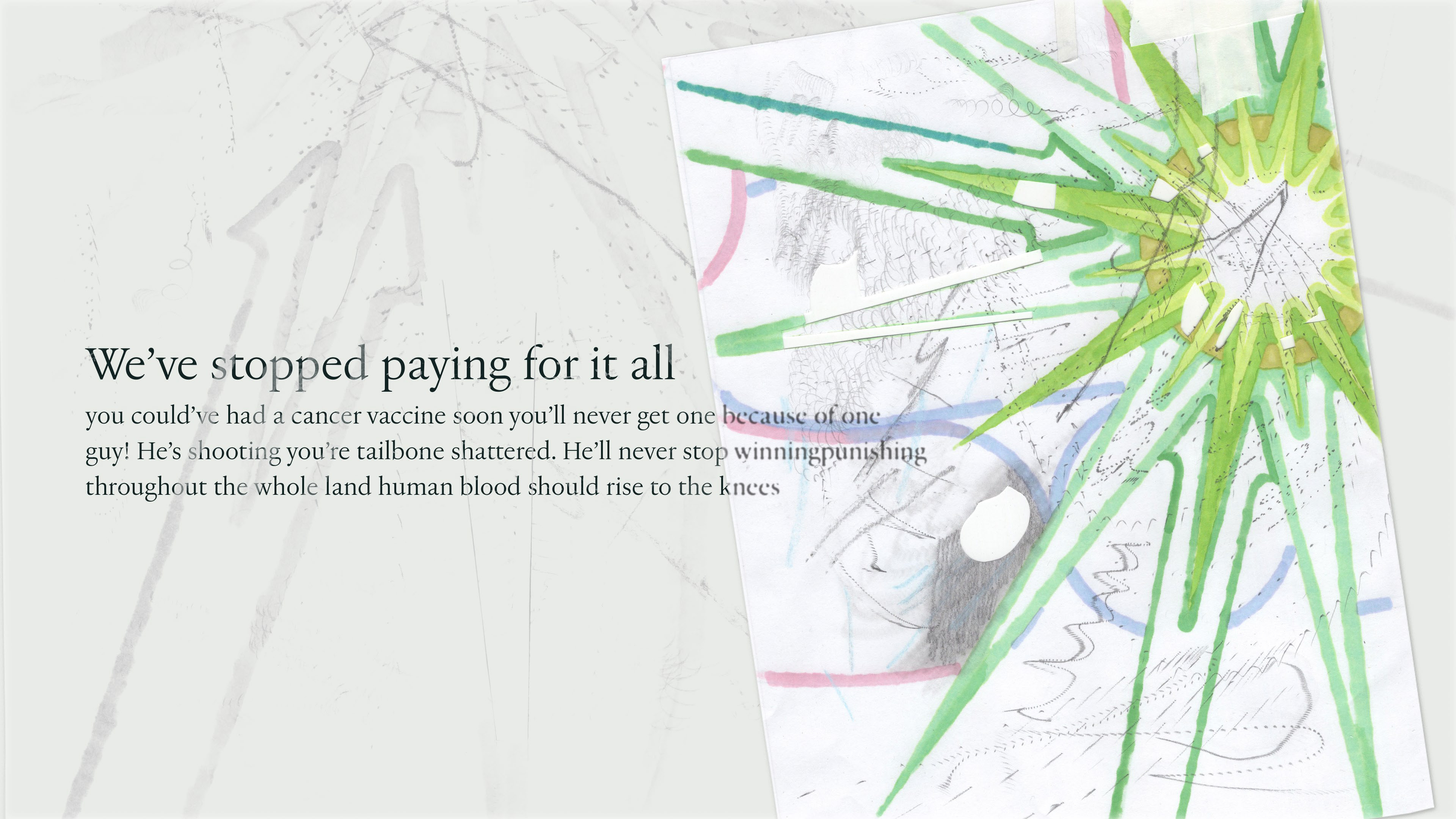 Last week I was in Milan and lucky enough to coincide with Sequin, Shadow, a solo exhibition by Vijay Masharani at Clima. I’ve followed Vijay’s work and writing online since meeting him in Glasgow a few years ago, but this was my first time getting to see it in person. The gallery is set back from the street, tucked into a green and quiet residential courtyard. Inside, a series of intricate pencil drawings line the space, interspersed with videos on wall-mounted iPads. At first glance the work seems preoccupied with geometry — columns, arches, stars and circles function as recurring motifs — yet each drawing develops variations and embellishments which, taken together, become figuratively suggestive (I want to say: ulterior). The forms might be lighthouses, portals, surveillance tools, migraine auras; sometimes they appear to embody a reluctant pronoun, an ‘i’ that leaks into its background, as in the histopathology sample-esque Red drawing, or the void-like grey of Ocean of Despair. Elsewhere they are almost legible as bodies, as in Visitation, where three figures appear to bend towards a fourth, like a nativity scene, or visitors around a hospital bed. What is and isn’t legible as body, and where the body is or isn’t in the work, is an open question. The single channel video Mask permutations is a mise-en-scène of various objects placed on and around a white thermoplastic radiotherapy mask. As the video cycles, medical training props of cross-sectioned hearts and bones appear on the mask’s ‘face’, where a hole seems to melt and spread into the shape of a mouth. It’s a face without a face, a disembodied quotation of ‘the body’ or its medicalised alienation, uncanny and unsettling. If the visitor happens to have read ‘Not Nothing, Not Enough’ — an essay by Masharani in Parapraxis, as I have — they may know that the artist is a Leukemia patient; yet the gallery text makes no reference to illness, or the context of the works’ making. Before I saw the show, Vijay and I spoke over email about how the disclosure of sickness can overdetermine the reception of one’s work, and about opacity and refusal. In the Parapraxis essay Vijay writes ‘I do not feel like a narrative subject at all anymore, but an unstable bundle of cells, some of which are deviant and trying to kill me.’ The drawings’ fading-out ‘i’s in a sea of cells might be biological realism, or a refusal to self-narrate — as per the individualised illness narrative — but they might also be a reckoning with the patient’s complicated place in, and reliance on, a medical system totally vulnerable to capitalism’s whims and sadisms. As Vijay puts it in an incredible collage sequence below, ‘Figuring all this out has never been immediately profitable.’