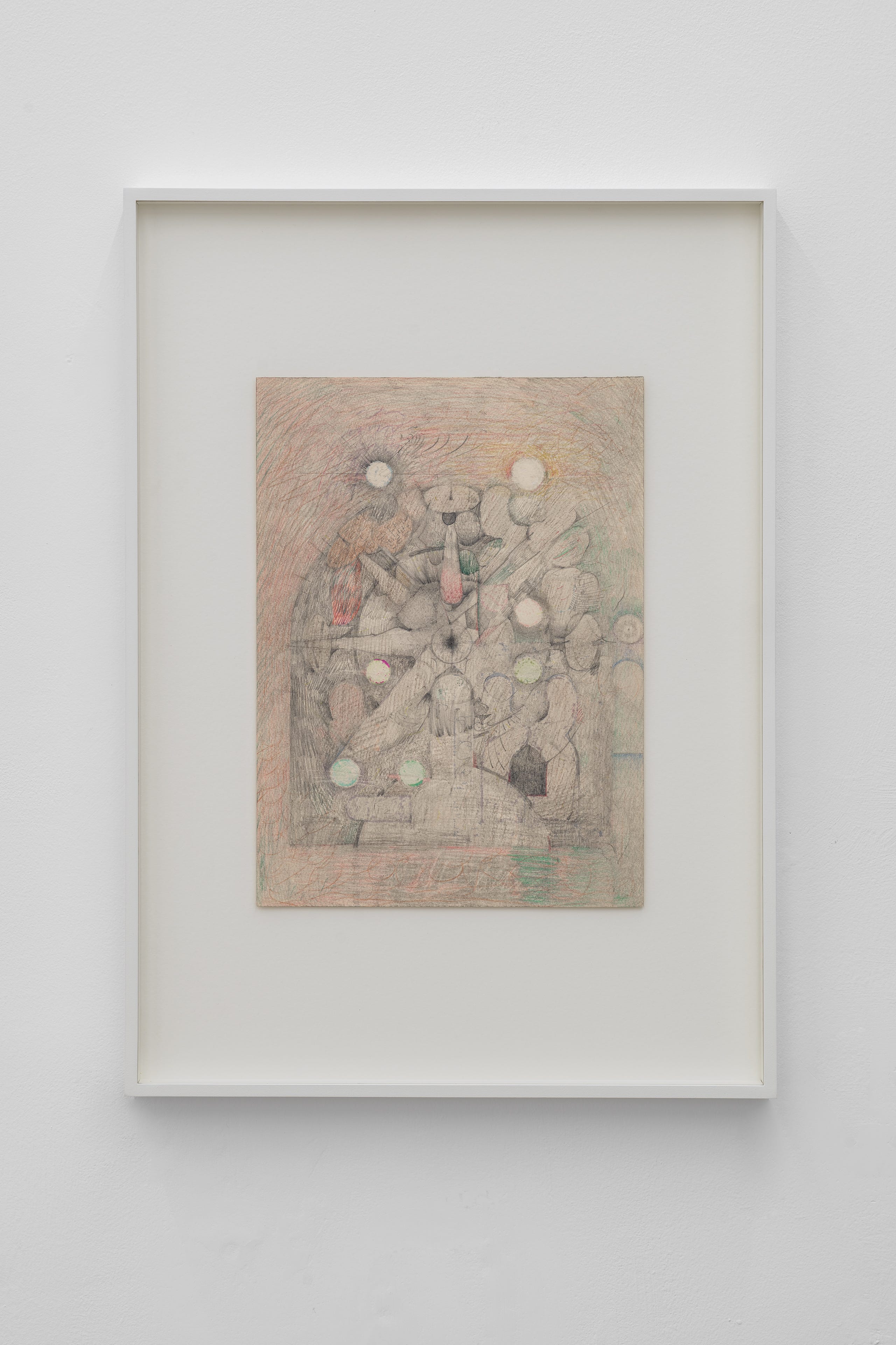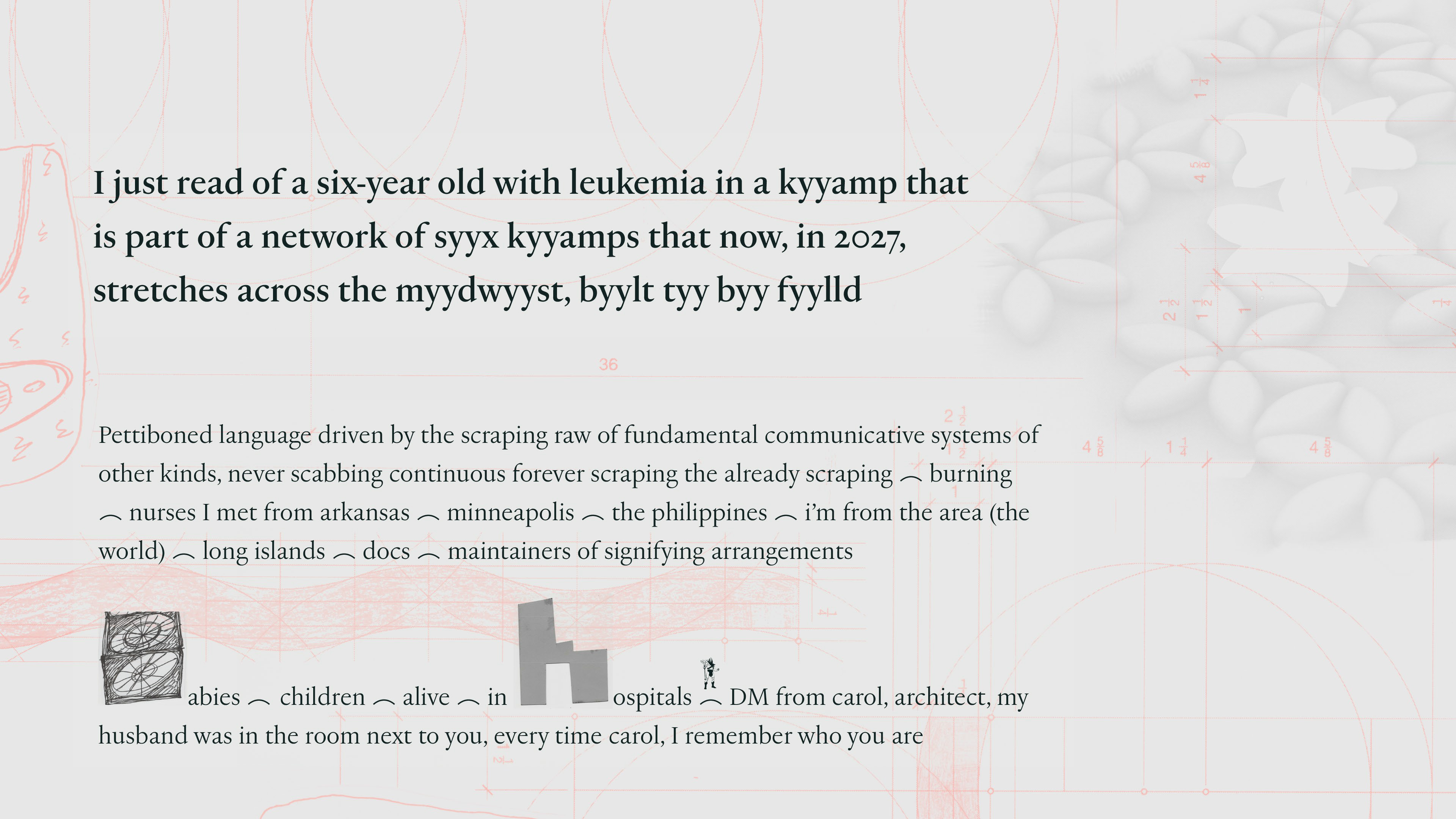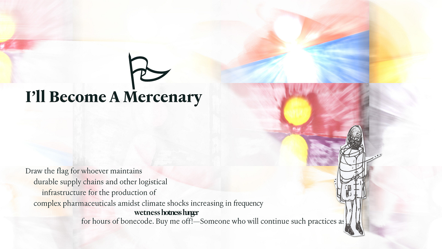 Last week I was in Milan and lucky enough to coincide with Sequin, Shadow, a solo exhibition by Vijay Masharani at Clima. I’ve followed Vijay’s work and writing online since meeting him in Glasgow a few years ago, but this was my first time getting to see it in person. The gallery is set back from the street, tucked into a green and quiet residential courtyard. Inside, a series of intricate pencil drawings line the space, interspersed with videos on wall-mounted iPads. At first glance the work seems preoccupied with geometry — columns, arches, stars and circles function as recurring motifs — yet each drawing develops variations and embellishments which, taken together, become figuratively suggestive (I want to say: ulterior). The forms might be lighthouses, portals, surveillance tools, migraine auras; sometimes they appear to embody a reluctant pronoun, an ‘i’ that leaks into its background, as in the histopathology sample-esque Red drawing, or the void-like grey of Ocean of Despair. Elsewhere they are almost legible as bodies, as in Visitation, where three figures appear to bend towards a fourth, like a nativity scene, or visitors around a hospital bed. What is and isn’t legible as body, and where the body is or isn’t in the work, is an open question. The single channel video Mask permutations is a mise-en-scène of various objects placed on and around a white thermoplastic radiotherapy mask. As the video cycles, medical training props of cross-sectioned hearts and bones appear on the mask’s ‘face’, where a hole seems to melt and spread into the shape of a mouth. It’s a face without a face, a disembodied quotation of ‘the body’ or its medicalised alienation, uncanny and unsettling. If the visitor happens to have read ‘Not Nothing, Not Enough’ — an essay by Masharani in Parapraxis, as I have — they may know that the artist is a Leukemia patient; yet the gallery text makes no reference to illness, or the context of the works’ making. Before I saw the show, Vijay and I spoke over email about how the disclosure of sickness can overdetermine the reception of one’s work, and about opacity and refusal. In the Parapraxis essay Vijay writes ‘I do not feel like a narrative subject at all anymore, but an unstable bundle of cells, some of which are deviant and trying to kill me.’ The drawings’ fading-out ‘i’s in a sea of cells might be biological realism, or a refusal to self-narrate — as per the individualised illness narrative — but they might also be a reckoning with the patient’s complicated place in, and reliance on, a medical system totally vulnerable to capitalism’s whims and sadisms. As Vijay puts it in an incredible collage sequence below, ‘Figuring all this out has never been immediately profitable.’