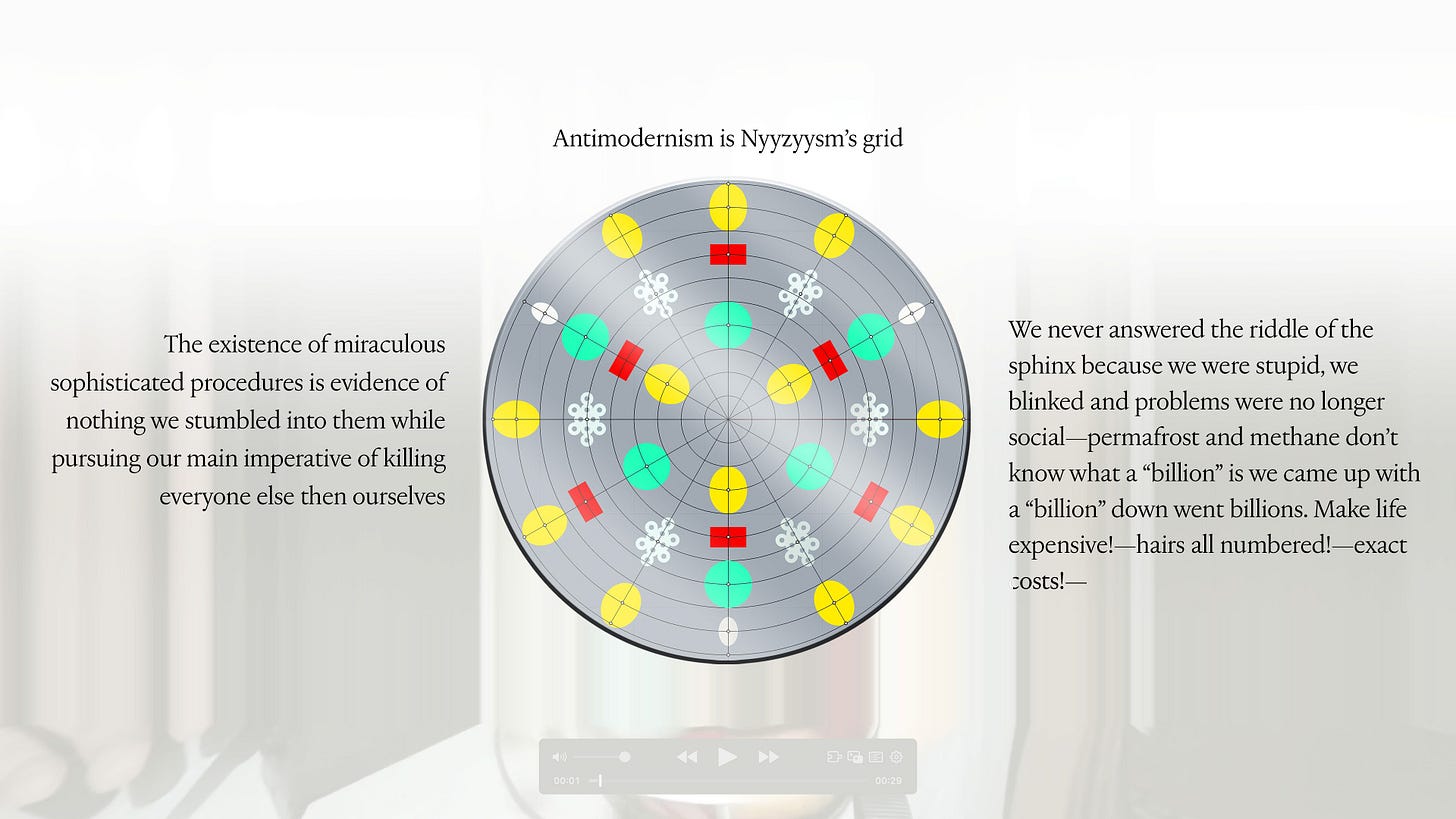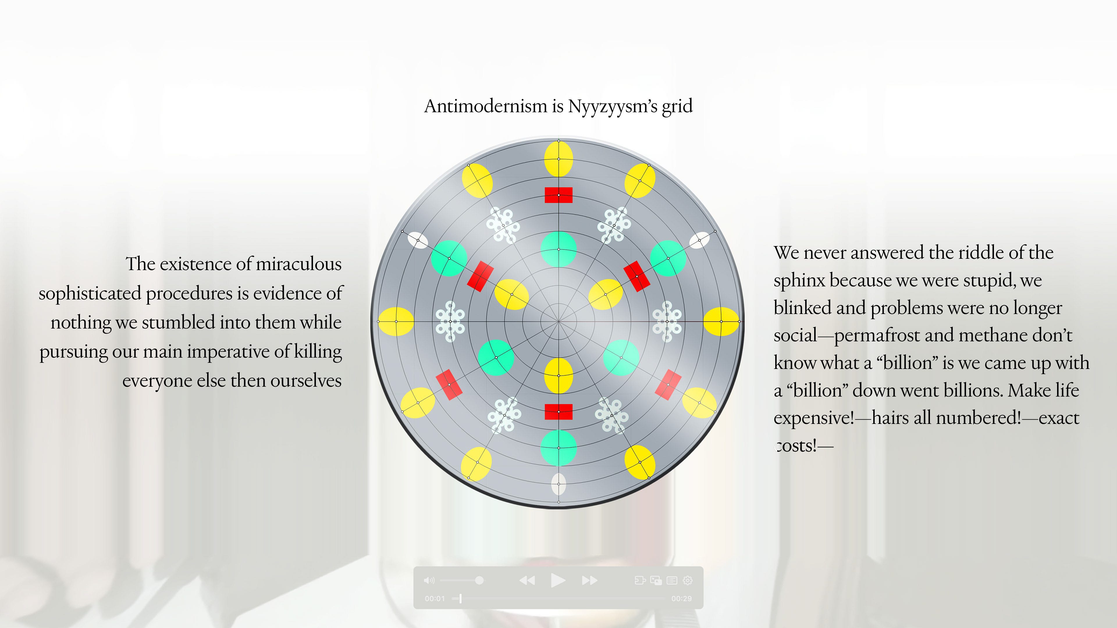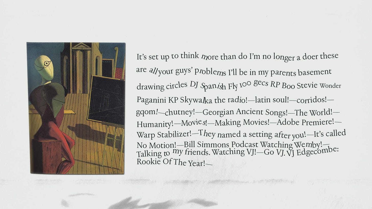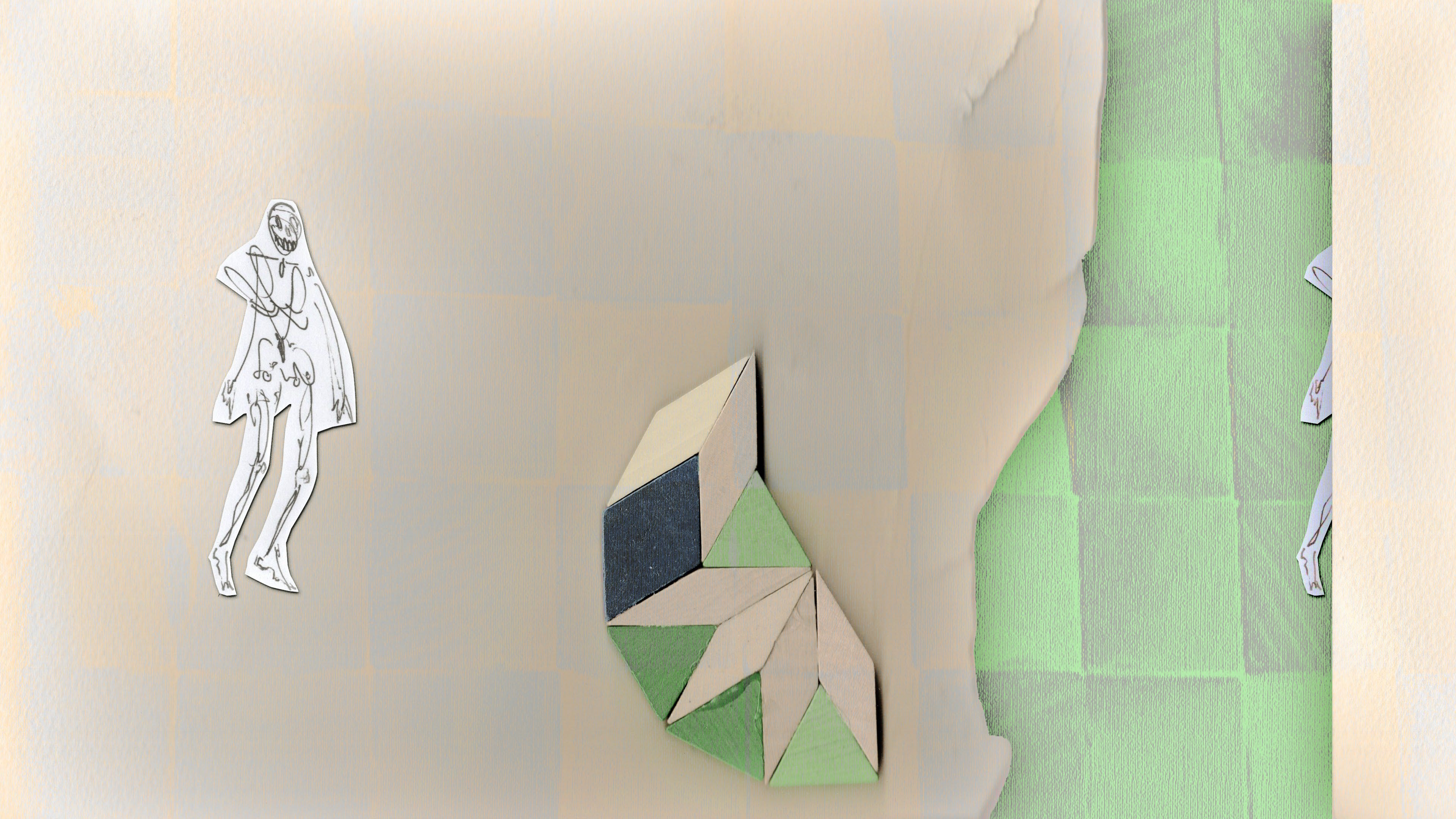 Last week I was in Milan and lucky enough to coincide with Sequin, Shadow, a solo exhibition by Vijay Masharani at Clima. I’ve followed Vijay’s work and writing online since meeting him in Glasgow a few years ago, but this was my first time getting to see it in person. The gallery is set back from the street, tucked into a green and quiet residential courtyard. Inside, a series of intricate pencil drawings line the space, interspersed with videos on wall-mounted iPads. At first glance the work seems preoccupied with geometry — columns, arches, stars and circles function as recurring motifs — yet each drawing develops variations and embellishments which, taken together, become figuratively suggestive (I want to say: ulterior). The forms might be lighthouses, portals, surveillance tools, migraine auras; sometimes they appear to embody a reluctant pronoun, an ‘i’ that leaks into its background, as in the histopathology sample-esque Red drawing, or the void-like grey of Ocean of Despair. Elsewhere they are almost legible as bodies, as in Visitation, where three figures appear to bend towards a fourth, like a nativity scene, or visitors around a hospital bed. What is and isn’t legible as body, and where the body is or isn’t in the work, is an open question. The single channel video Mask permutations is a mise-en-scène of various objects placed on and around a white thermoplastic radiotherapy mask. As the video cycles, medical training props of cross-sectioned hearts and bones appear on the mask’s ‘face’, where a hole seems to melt and spread into the shape of a mouth. It’s a face without a face, a disembodied quotation of ‘the body’ or its medicalised alienation, uncanny and unsettling. If the visitor happens to have read ‘Not Nothing, Not Enough’ — an essay by Masharani in Parapraxis, as I have — they may know that the artist is a Leukemia patient; yet the gallery text makes no reference to illness, or the context of the works’ making. Before I saw the show, Vijay and I spoke over email about how the disclosure of sickness can overdetermine the reception of one’s work, and about opacity and refusal. In the Parapraxis essay Vijay writes ‘I do not feel like a narrative subject at all anymore, but an unstable bundle of cells, some of which are deviant and trying to kill me.’ The drawings’ fading-out ‘i’s in a sea of cells might be biological realism, or a refusal to self-narrate — as per the individualised illness narrative — but they might also be a reckoning with the patient’s complicated place in, and reliance on, a medical system totally vulnerable to capitalism’s whims and sadisms. As Vijay puts it in an incredible collage sequence below, ‘Figuring all this out has never been immediately profitable.’